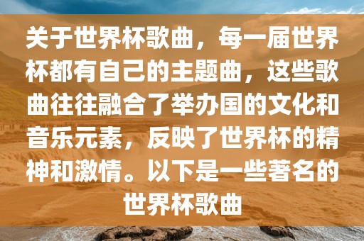 关于世界杯歌曲,每一届世界杯都有自己的主题曲,这些歌曲往往融合了举办国的文化和音乐元素,反映了世界杯的精神和激情。以下是一些著名的世界杯歌曲