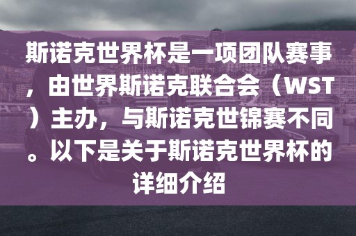 斯诺克世界杯是一项团队赛事,由世界斯诺克联合会(WST)主办,与斯诺克世锦赛不同。以下是关于斯诺克世界杯的详细介绍