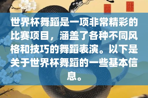 世界杯舞蹈是一项非常精彩的比赛项目,涵盖了各种不同风格和技巧的舞蹈表演。以下是关于世界杯舞蹈的一些基本信息。