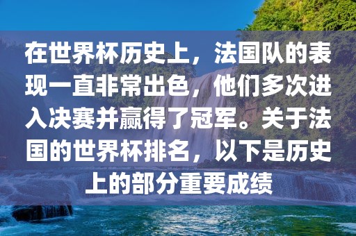 在世界杯历史上,法国队的表现一直非常出色,他们多次进入决赛并赢得了冠军。关于法国的世界杯排名,以下是历史上的部分重要成绩