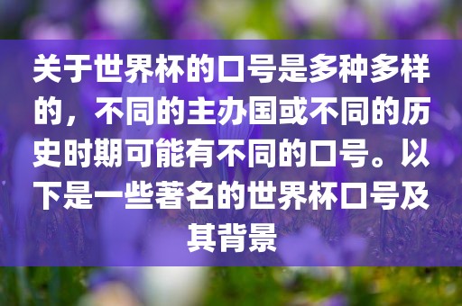 除此之外,每一届世界杯也都有自己的独特口号,旨在表达主办国对足球的热情和对世界杯的期待,这些口号不仅代表了世界杯的精神和文化内涵,也成为了世界杯历史的重要组成部分,如果您对某一届世界杯的口号有更具体的问题,欢迎继续向我提问。