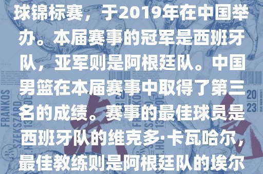 摘要:2019年国际篮联篮球世界杯在中国举办,西班牙队夺得冠军,中国男篮取得第三名。最佳球员为西班牙队的维克多·卡瓦哈尔,最佳教练为阿根廷队的埃尔南多·贝拉斯科。本届赛事创造了多项纪录,包括观众人数超过全球电视观众人数等。