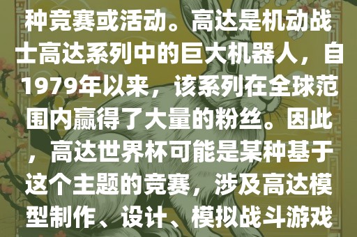 为了获取关于“高达世界杯”更具体的信息,您可以尝试在社交媒体平台上搜索相关话题,或者查看与高达相关的官方网站和论坛,不过截至当前时间,我并没有具体关于“高达世界杯”的详细信息,如果您想了解具体的活动情况,建议访问相关社区获取最新和详细的信息。