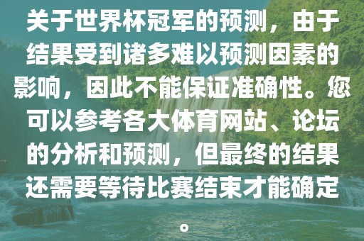 摘要:关于世界杯冠军的预测存在不确定性,因为结果受到许多难以预测的因素影响。可以参考体育网站和论坛的分析和预测,但最终结果需等待比赛结束才能确定。任何预测都只是参考,实际结果可能会有所不同。