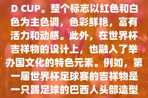 世界杯标志由足球、国际足联英文缩写FIFA和世界杯英文名称WORLD CUP三部分组成,以红色和白色为主色调,充满活力。吉祥物设计融入举办国文化元素,展现了足球运动精神和举办国特色。标志旨在展现足球的激情与举办国的文化韵味。