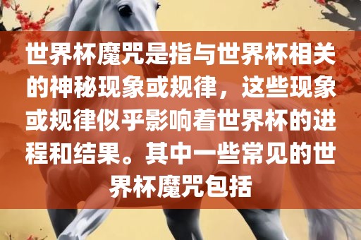 世界杯魔咒是指与世界杯相关的神秘现象或规律,这些现象或规律似乎影响着世界杯的进程和结果。其中一些常见的世界杯魔咒包括