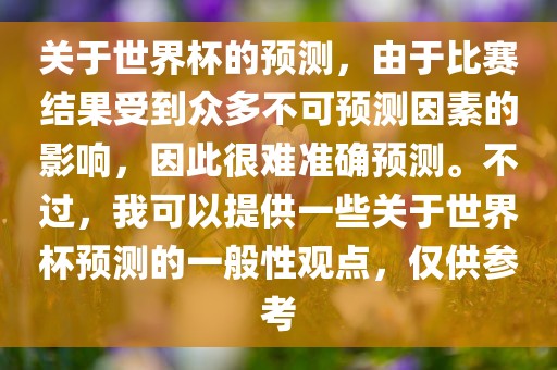 关于世界杯的预测,由于比赛结果受到众多不可预测因素的影响,因此很难准确预测。不过,我可以提供一些关于世界杯预测的一般性观点,仅供参考